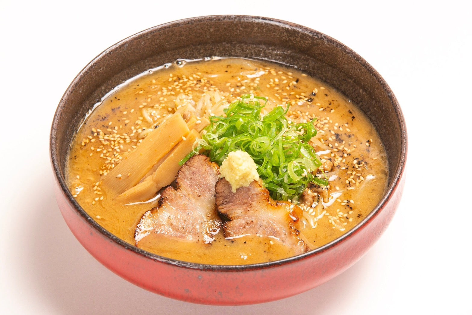 - 特注ちぢれ麺のもちもち食感: 北海道産小麦(ルルロッソ)を使用した特注の中太ちぢれ麺。つるりと滑らかな口当たりと独特の弾力を持つ麺はスープとの絡みも抜群で、プリプリとした歯ごたえが濃厚スープに負けない存在感を発揮します。噛むほどに広がる小麦の風味もお楽しみいただけます。
