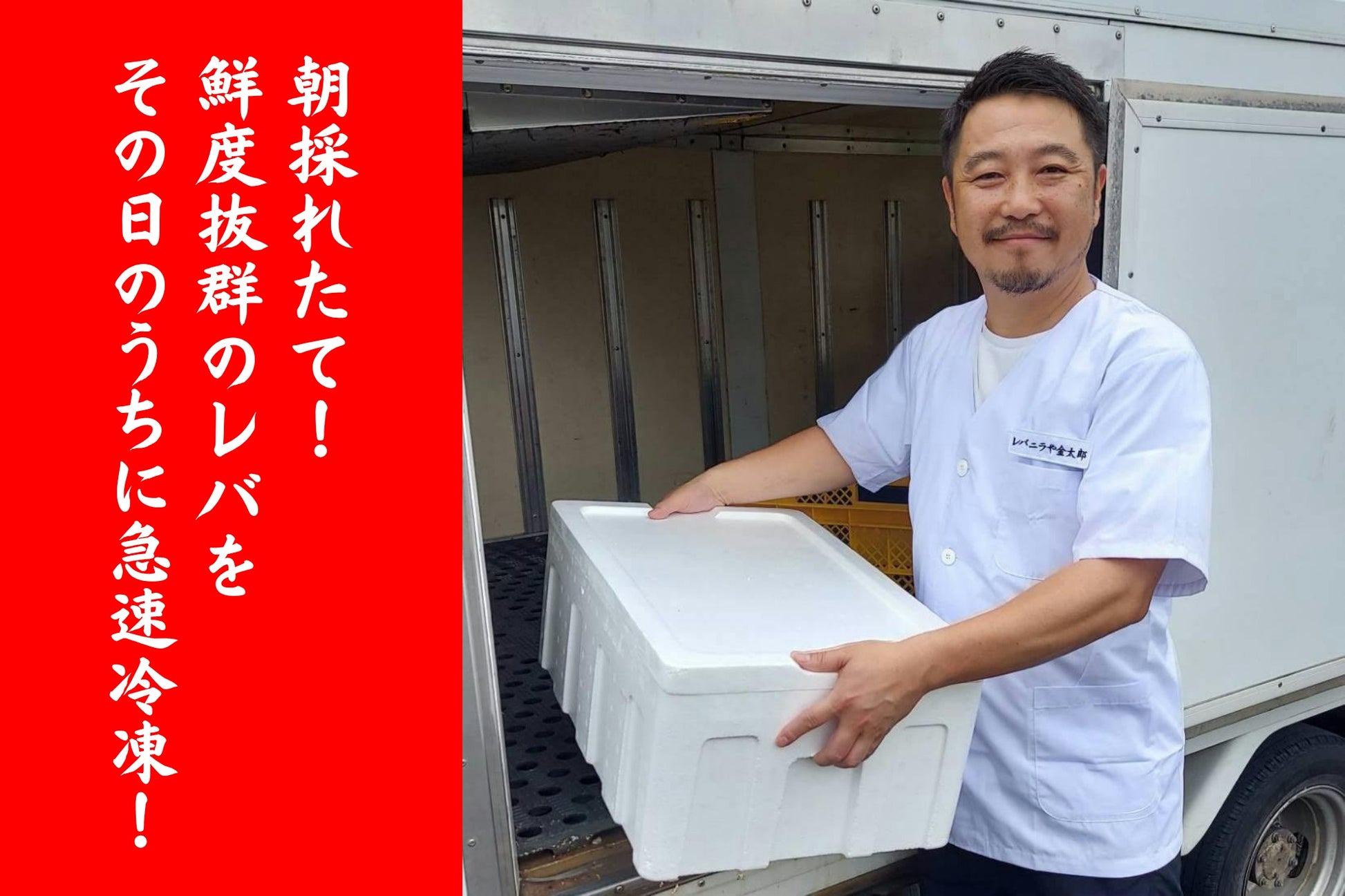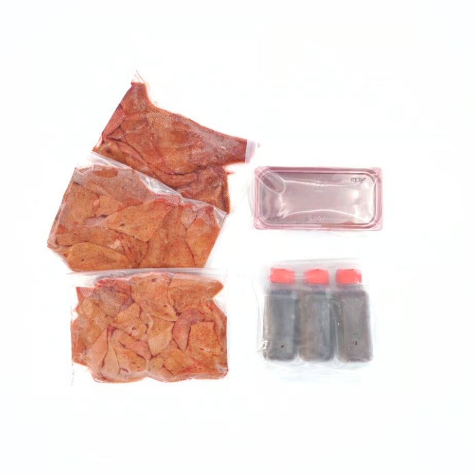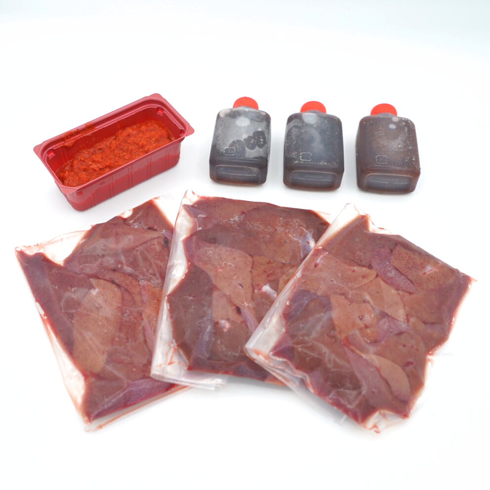 具材(豚レバー)100g×3/特製タレ60g×3/辛味50g×1を真空小分け・急速冷凍でお届け。